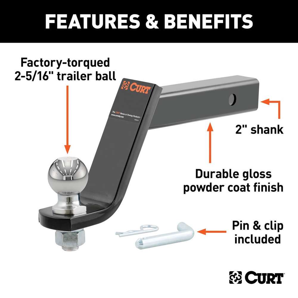 - Factory-torqued CURT trailer ball accepts a 2-5/16" coupler